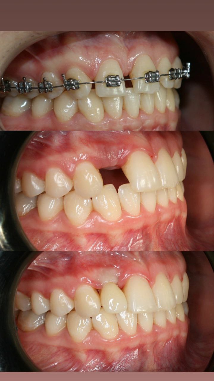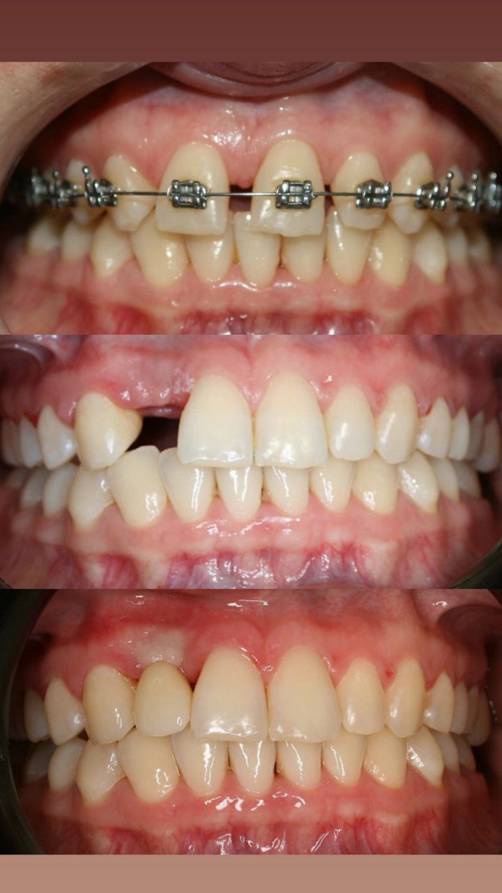 Выполнено: лечение с помощью брекет-системы на верхнем зубном ряду ( установлена брекет-система МТХ, DynaFlex, США), фиксация навесного искусственного зуба во время ортодонтического лечения, имплантация и протезирование в области отсутствующего зуба